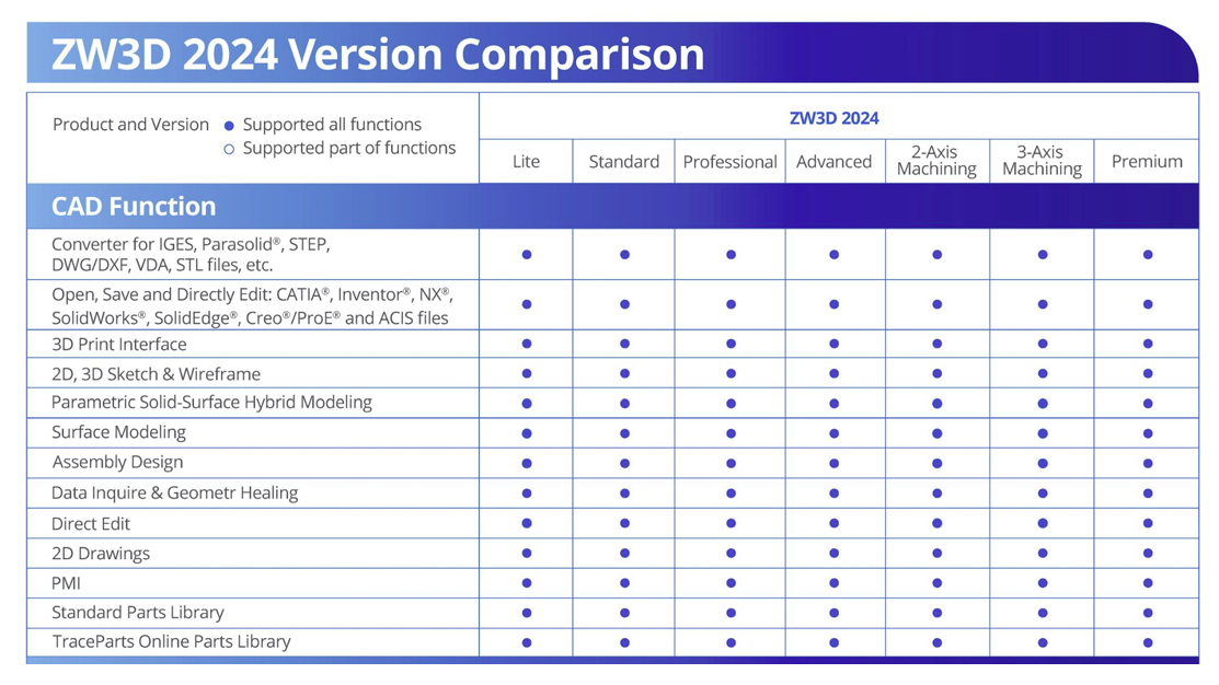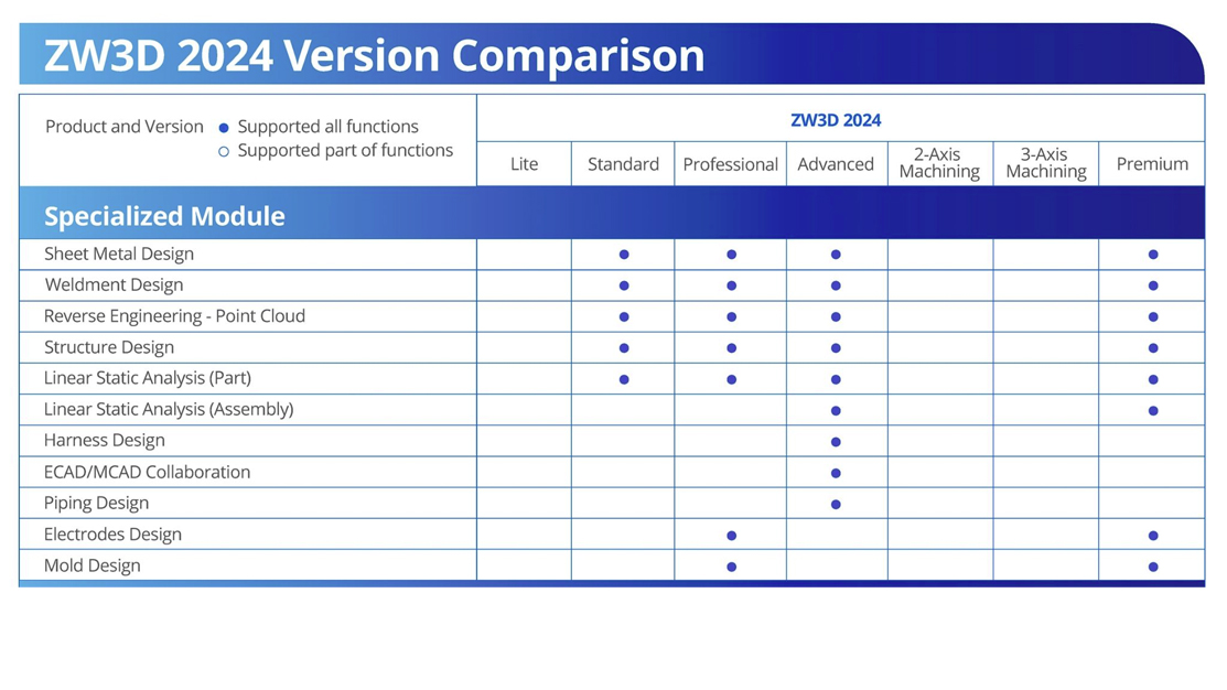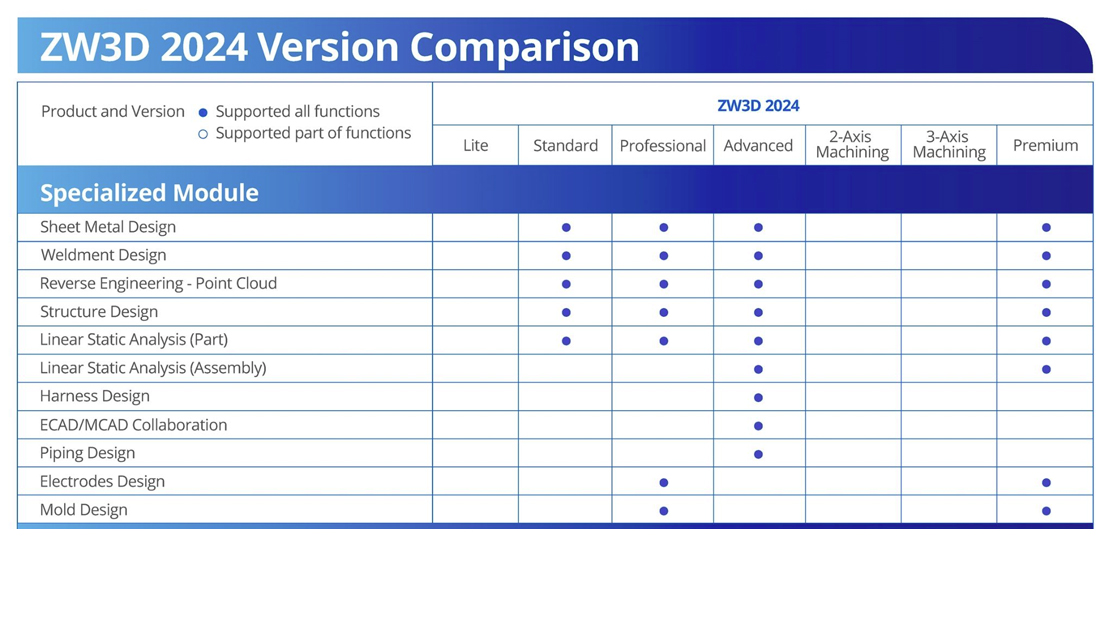 ZW3D cocok untuk Anda gunakan dalam industri kecil, menengah, workshop / bengkel bubut, maupun perusahaan besar dengan puluhan engineer. ZW3D memenuhi kebutuhan Anda dengan fitur-fitur lengkap dan canggih termasuk pemodelan secara hybrid memanfaatkan surface dan solid, simulasi struktural, pemesinan 2 hingga 5 axis, dan fitur khusus untuk sheet metal, Mold Wizard, dan masih banyak lagi.